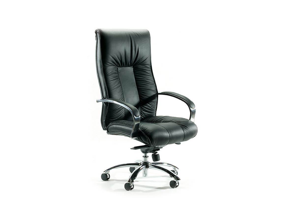 Full Sized chair for heavy hitters. Sink into the puckered real leather upholstery. Lean back and lock while you ponder the world and how to conquer it. Leather padded arms and polished chromed metal base and arms exude authority